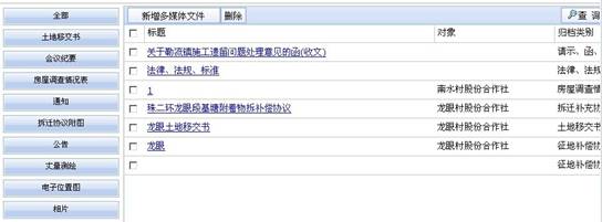 其中,资料管理主要用于存放征地拆迁过程中涉及的相关图片、文档、公告等文件资料。如果文件是电子文档,系统会自动按照文件格式打开,如果文件时图片,系统会自动生成略缩图,也可以打开原图片。